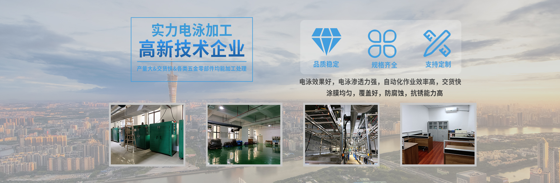 本公司創(chuàng)始于2004年,由專業(yè)的涂料技術(shù)專家及應(yīng)用技術(shù)工程師發(fā)起并組建的高新技術(shù)企業(yè),專業(yè)從事各類金屬電泳涂裝,是專業(yè)的電泳涂料、電泳加工及配套設(shè)備供應(yīng)的高科技公司。 本公司依托多年從事電泳的經(jīng)驗(yàn)技術(shù),對(duì)多種材料(銅、鋁、鐵、不銹鋼、鋅合金、鋁合金等材料)表面處理的研究,采用先進(jìn)的工藝與進(jìn)口原料的配合,完全可以保證客戶產(chǎn)品的表面涂裝,能達(dá)到出口產(chǎn)品的標(biāo)準(zhǔn)要求。主要電泳白色、透明、黑色和紅色、藍(lán)色、黃色、紫色等多種彩色。 憑著先進(jìn)的電泳技術(shù)和嚴(yán)格的品質(zhì)要求,本著以最高的客戶滿意度為目標(biāo),這幾年時(shí)間,我們已得到了精密電子五金、衛(wèi)...